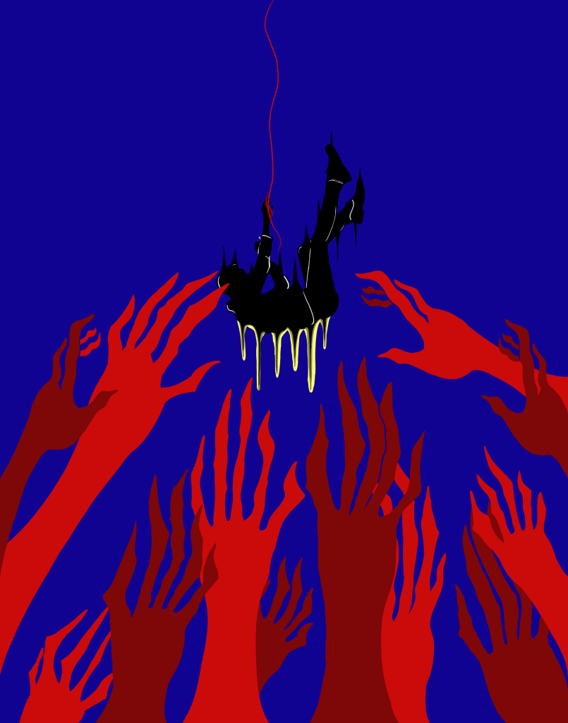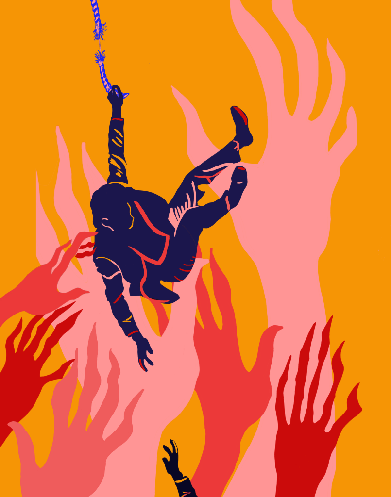Final Presentation: Showing a person who is about to fall and is holding onto a rope but the body is about to break, showing the tension of the word “tension” before the impending event.